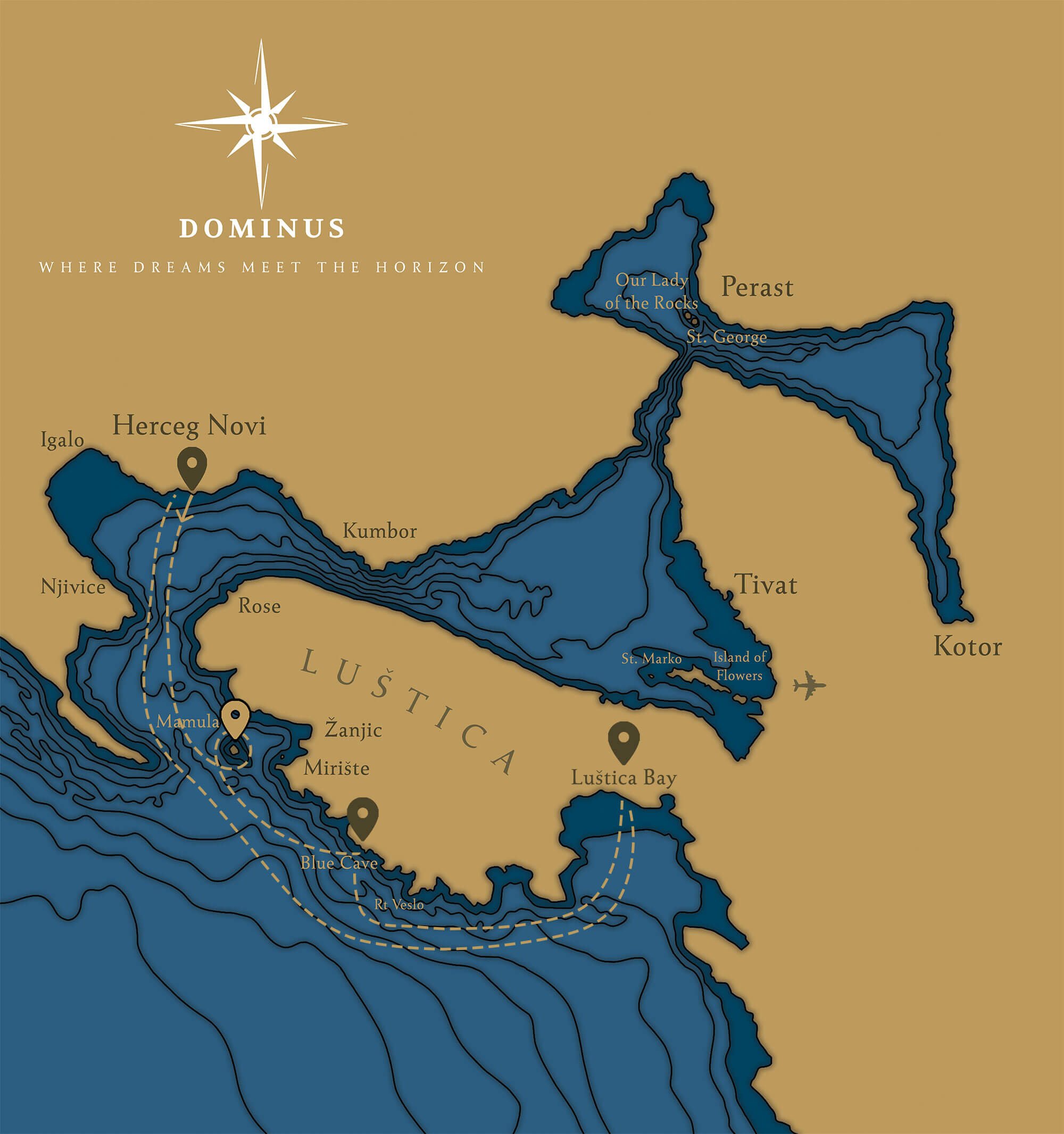 Set sail with Dominus Charter Boats for an unforgettable private tour. Cruising past Mamula Island gives you a unique experience of the island which keeps numerous secrets and untold stories. Diving into the mesmerizing waters of the charming Blue Cave will leave timeless memories of visiting Montenegro’s beautiful coastline. As a peak of a tour, you will have the opportunity to explore and enjoy the newly built luxury complex Lustica Bay.